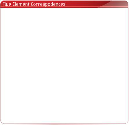This is a collection of references from various sources regarding the Five elements and their correspondences in physical terms. These range from the physical body, emotions, types of mind, directions, seasons, transformations, strengths and weaknesses, vocations, and more.