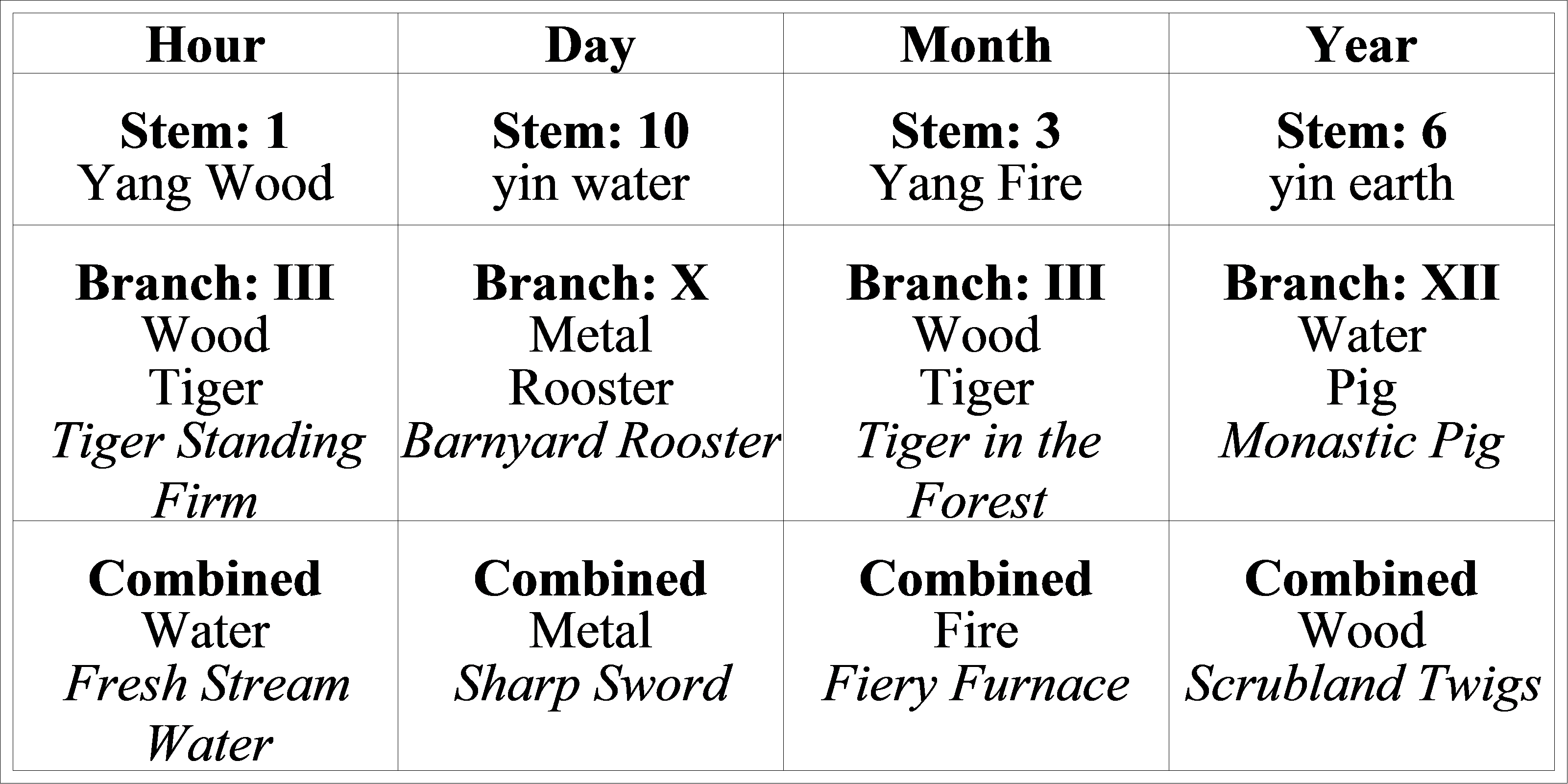 Wood, with a count of 4, over-controls Earth, choking the water channels, draining the soil of sustenance and leaving broken soil from which the roots of trees must be removed before the earth can be compacted. With a balance of Wood and Earth, the Wood element keeps the Earth in place and prevents erosion. But this time there is too much growth, which brings us to the Water element. Water feeds Wood in the generating cycle, and there again is an imbalance between Earth and Water. Water is too strong, which either carries away the Earth, feeds the vegetation (Wood) over-abundantly and contributes to the excess Wood that we see. That being said, it will be a very creative year (Wood governs expansion and creativity), but the problem will be to ‘ground’ the energies. That will have to wait for another year or for a more auspicious month. We cannot go into that here, as there is too much to cover.
