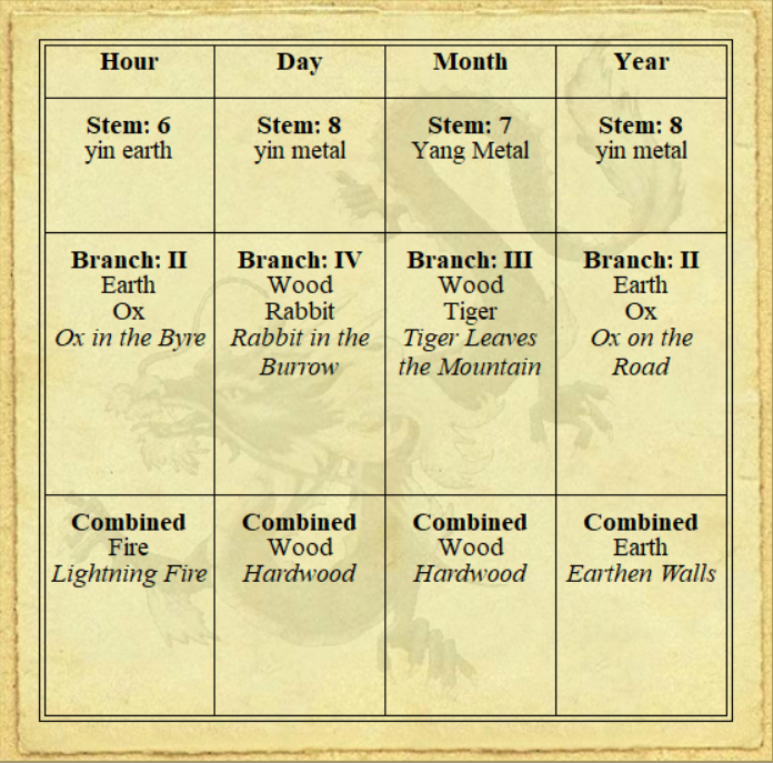 This particular Ox has the following mottos: “There is much to be gained in constant movement. Attention to a good diet never goes astray, either. Though health problems might be present, a change of climate often brings a cure.”[1] In addition, the combined element for the year states that “adequate precautions prevent future calamities.”