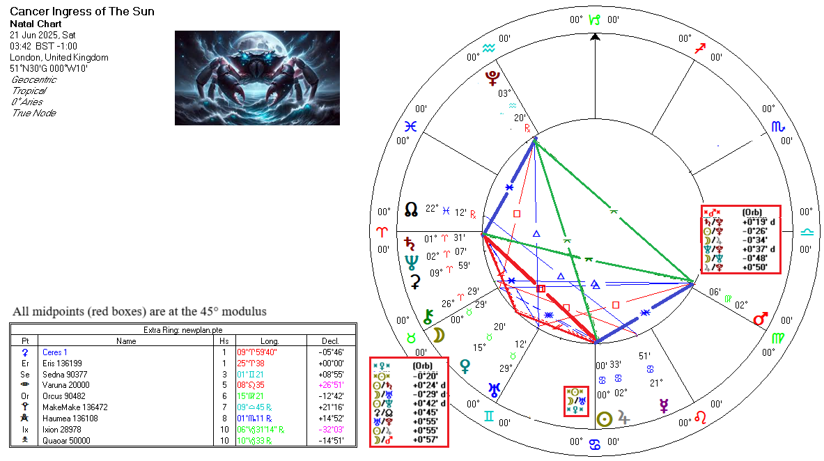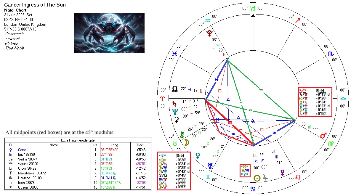 The Sun entered Cancer at 02:42 UTC on 21 Jun 2025. The chart is below (bigger):