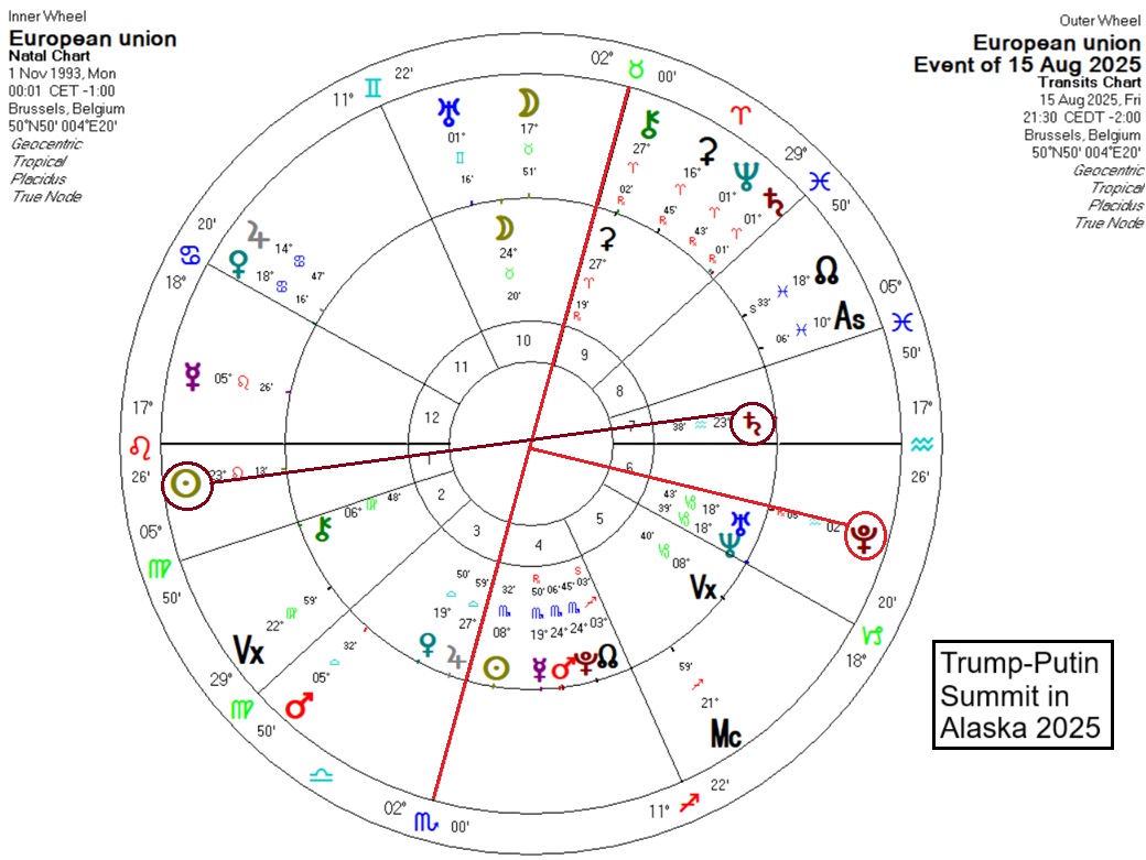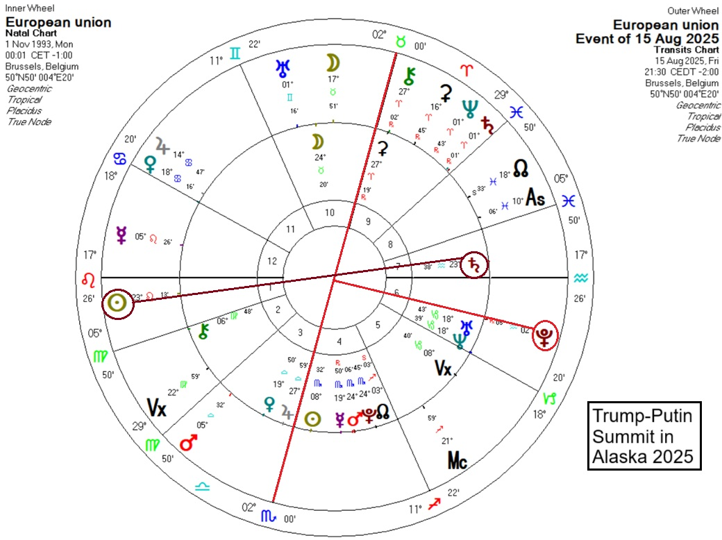 The solar arcs to the EU’s chart at the summit did not show anything outstanding, but if we look at the meeting of the Servile Seven at the White House that evening we note transiting Pluto was square the Meridian axis for the EU, almost exactly. The EU leadership sabotaged themselves that day and set the apparent course for the dissolution of the EU over the next years. They did so by promising to buy very expensive American weaponry to supply to Ukraine to keep it afloat, with money they do not have, and with a population that wants to see the war ended. The EU leaders who were present that day at the White House have other ideas. They want the war to continue, otherwise they lose their relevance.