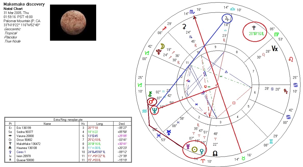 The Ascendant of the chart was conjunct the dwarf planet Makemake (MAH-keh MAH-keh pronunciation). Makemake is a classical Kuiper belt object (KBO), meaning its orbit is independent of the gravitational perturbations we see with the plutinos. In other words, it is not locked into an orbital resonance with other planets. It is named after the creator god of the Rapa Nui people of Easter Island. The discovery charts for these new additions to astrology say a lot about how they operate, or what they mean to us, anyway.