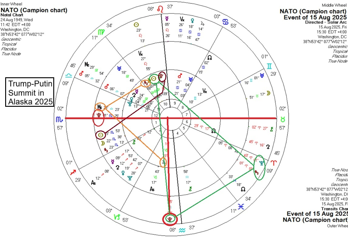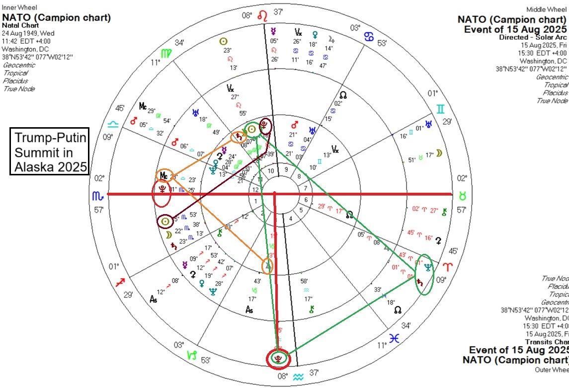 Not highlighted in the chart were transiting Uranus and Pluto, both trine the US Midheaven, showing the sudden, hurried nature of the summit as well as its success along certain lines as well as the upsets it caused with other parties, which we will cover next. And then we note the cross of matter for the summit is the same as that of the US. If an American astrologer picked the timing for the summit (entirely possible), they couldn’t have picked a better day or time, given the time constraints involved. Astrologers are often given difficult timelines by clients to find favourable outcomes. This one is a case in point. Trump was in a hurry. He needed a distraction from his domestic woes (tariff blowback, Epstein, etc.) and a big WIN. Then we turn to NATO.