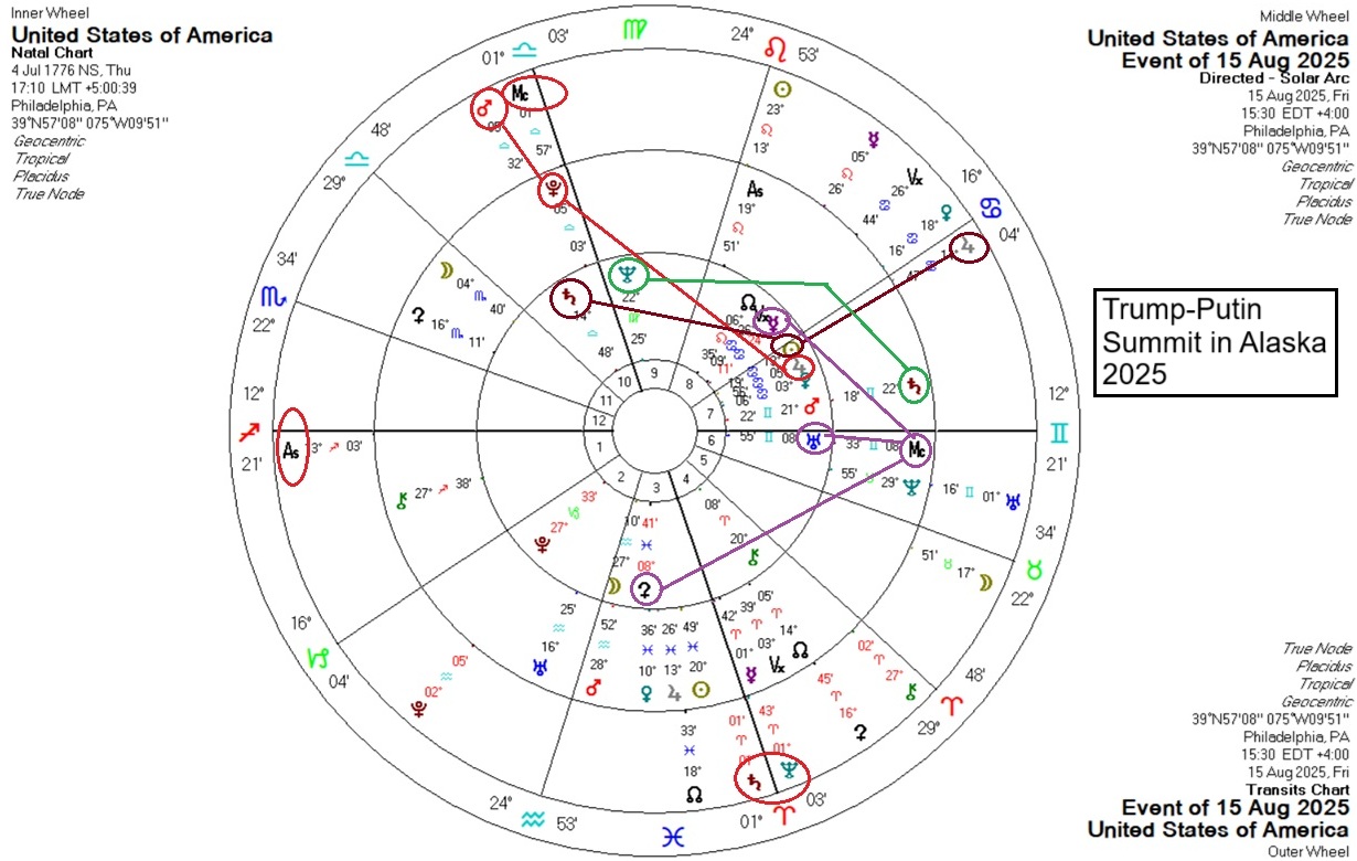 The ambition for the summit on the American side, represented by the natal Sun/Saturn square, showed transiting Jupiter conjunct the US Sun. Hopes were high for a ceasefire at least, if not a pathway for ending the war. They were to be disappointed. The natural idealism of the US – its evangelical zeal for impressing its ideals on every nation – shown by the natal Mars/Neptune square, showed the approaching solar arc of Saturn square to the natal Neptune, throwing cold water on the idea that Russia could be cajoled into some sort of deal. They got a deal, but it was about oil instead of a ceasefire.