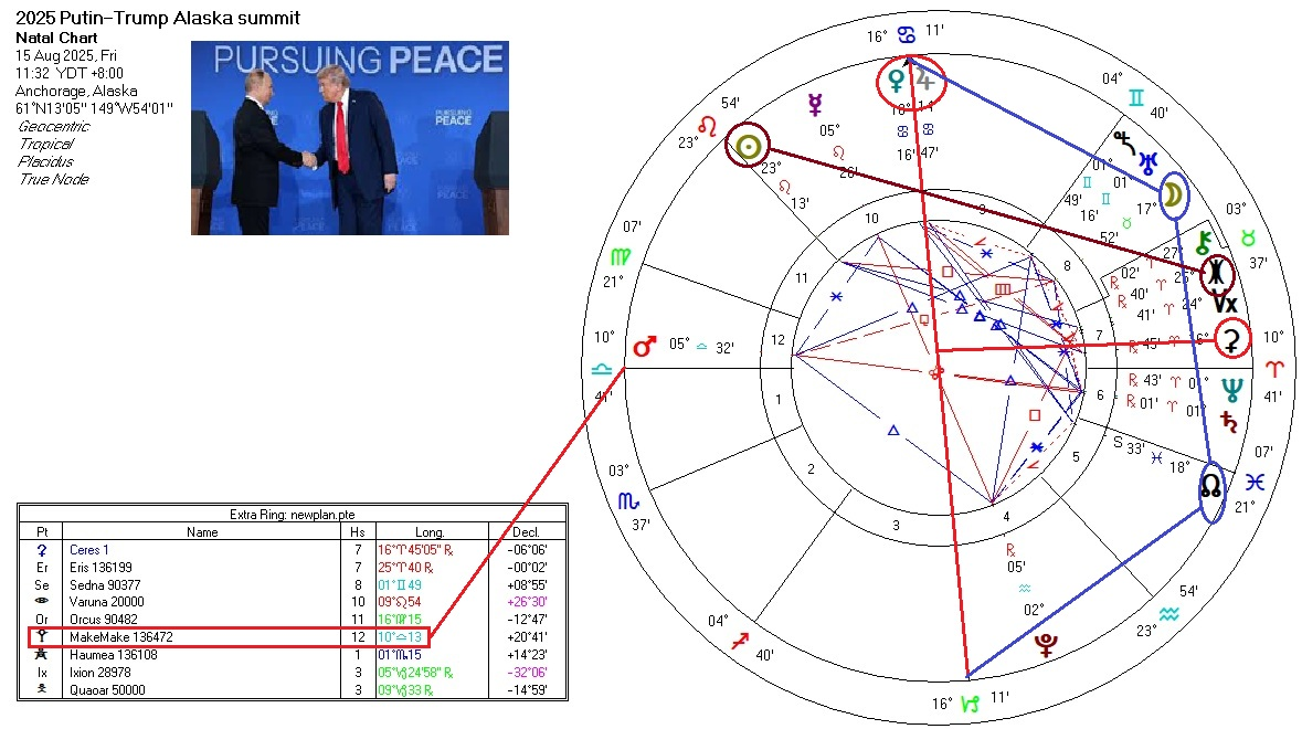 The symbol for the first time shows the hope for the summit – a peace deal and an end to the war. No analyst who knew both sides’ views on the war expected a peace deal. At best the expectation was that the two sides would begin talking. It that sense the summit went better than expected. That is shown in the chart, starting with the Libra Ascendant and the Venus/Jupiter conjunction straddling the Midheaven.