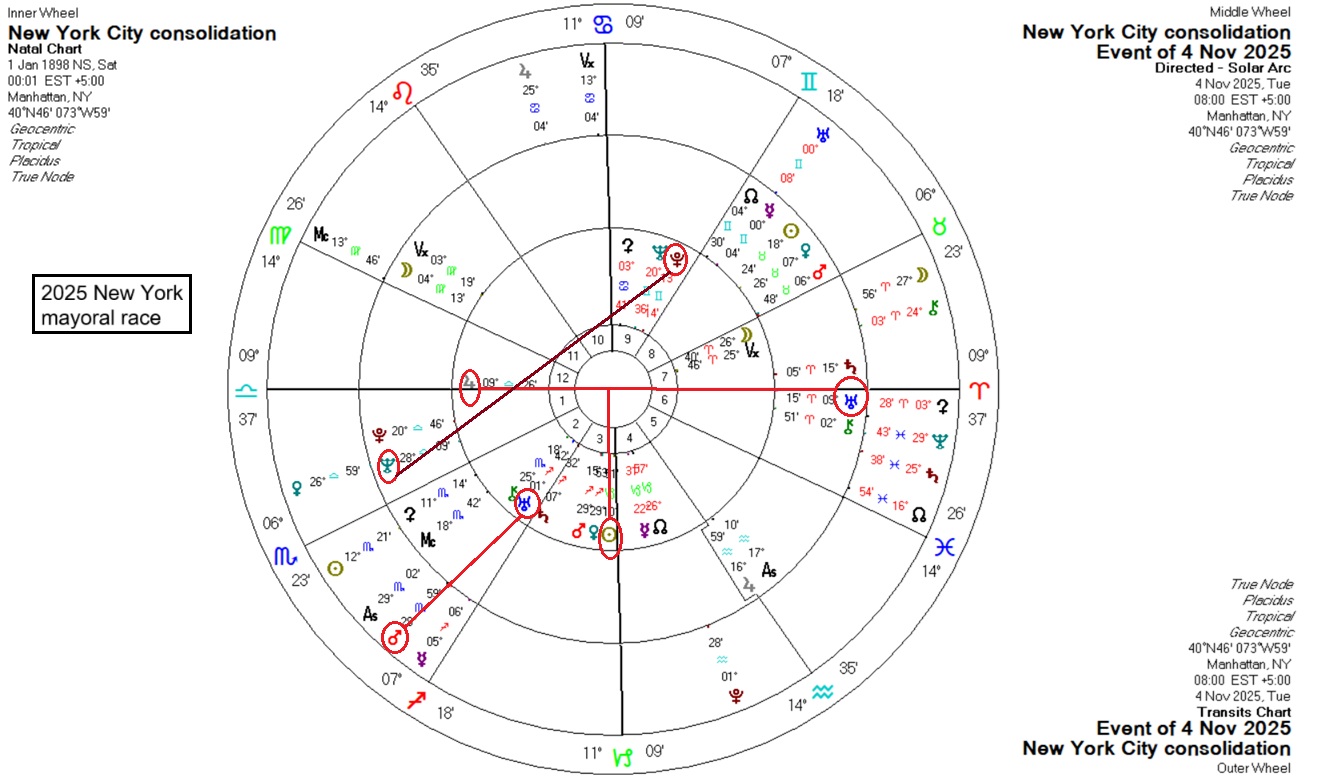 Given the preceding, what shows in the chart for New York with his election? Mamdani will be mayor over the five boroughs of the greater New York area. The consolidation of NYC was legislated and came into effect at midnight at New Year 1898, so we look to the consolidation chart for NYC with transits and directions for the election result, which is below (bigger):