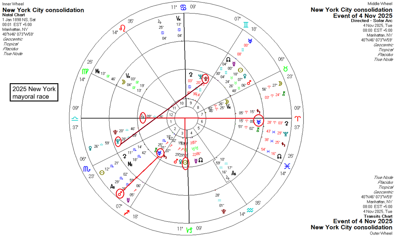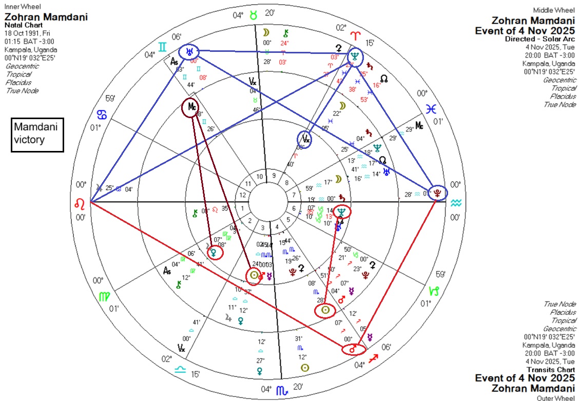 We note in particular the influence of Neptune. Neptune and Uranus have co-rulership over elections. Uranus governs the change that elections bring, whereas Neptune governs through the emotions of the public, which figure so strongly in political campaigns – along with all the campaign promises the politicians make. In the election chart for Mamdani transiting Neptune sits on his natal Vertex and trines his ascendant. We see the transiting triangle of Uranus, Neptune and Pluto that has been with us for months now all figuring positively with his horizon axis. That triangle was also joined by transiting Mars, having just passed his directed Sun, the latter aspecting his natal Neptune. Transiting Mars was trine his Ascendant on the day. And lastly, we see his directed Midheaven aspecting his natal Sun and Venus. With transiting Pluto on his Descendant he trounced his opponents.