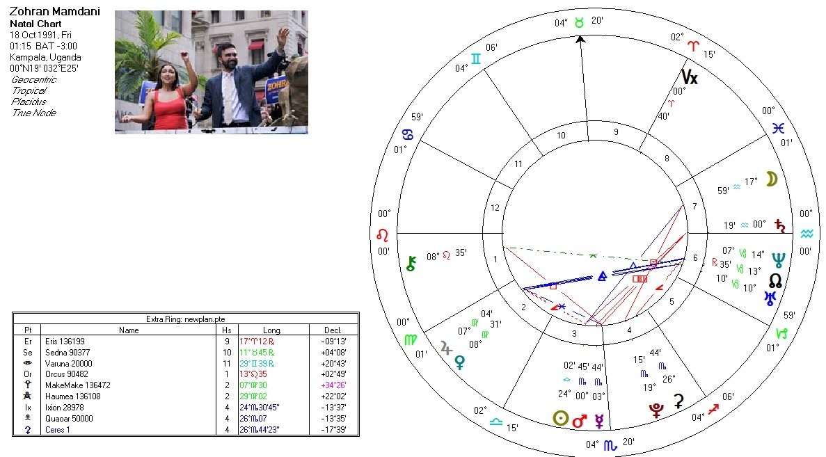 Mamdani was born in Kampala, Uganda on 18 October 1991 at 1:15 in the morning Uganda time, according to his mother. The birth chart slows 0° Leo rising, which may or may not be accurate. 1:15 is a rounded off time. He could have Cancer rising, actually. But Leo rising gives Mamdani the magnetism he displayed during the election. Along with that, we see Mars and Mercury conjunct and square the Horizon axis, with the Moon trine the Sun.