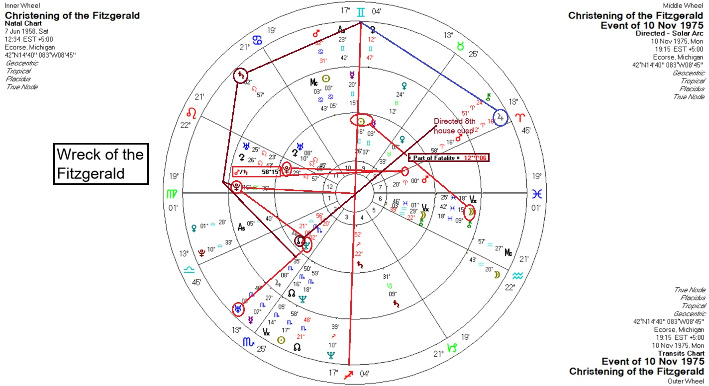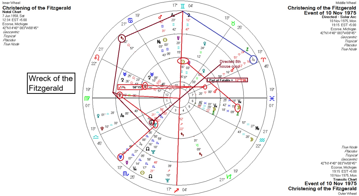 The Fitz was as much a test case as it was meant as a money-making venture. But cost saving, when unproven, can prove to be disastrous, as Boeing found with its 737 Max planes. With the preceding points as the backdrop, that brings us to the chart for the sinking of the Fitz, based this time on the christening chart for the ship. The chart with transits and directions is below (bigger):