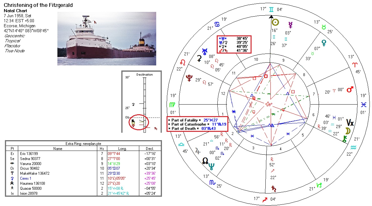 In the previous post on the Fitzgerald we noted that the christening had an ominous note to it. The customary christening bottle did not break on the first attempt. We note in the christening chart the Venus square to Uranus (unusual events and/or relations regarding women) with Saturn at the apex of the Finger of the World pattern that the Venus/Uranus square forms with Saturn. That showed the difficulties with the launch. The dockworkers had trouble removing the slip blocks which allowed the ship to enter the water. One of the spectators had a heart attack while witnessing the event and died at the scene. Any superstitious sailor would have told you those were terrible omens for the ship. What else do we see in the chart?