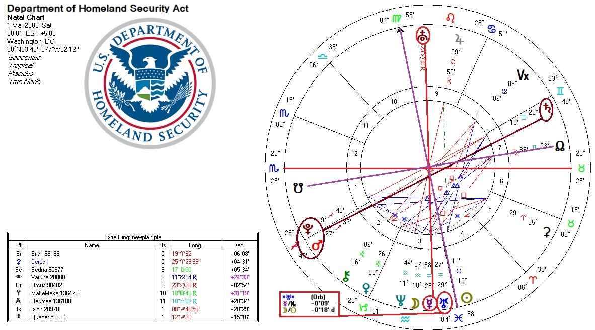 With all this in mind, what do we see in the chart for the DHS, above? The chart shows the Sun in Pisces (a fluid and changeable temperament), the Moon in Aquarius, with Scorpio rising. The immediate stand out in the chart is a Great Cross formed by the Horizon axis, which is squared by Orcus in the ninth house (foreign influence) and Mercury in the third house (public discourse). Orcus is the disciplinarian of the zodiac, the punisher of broken oaths in its mythology.