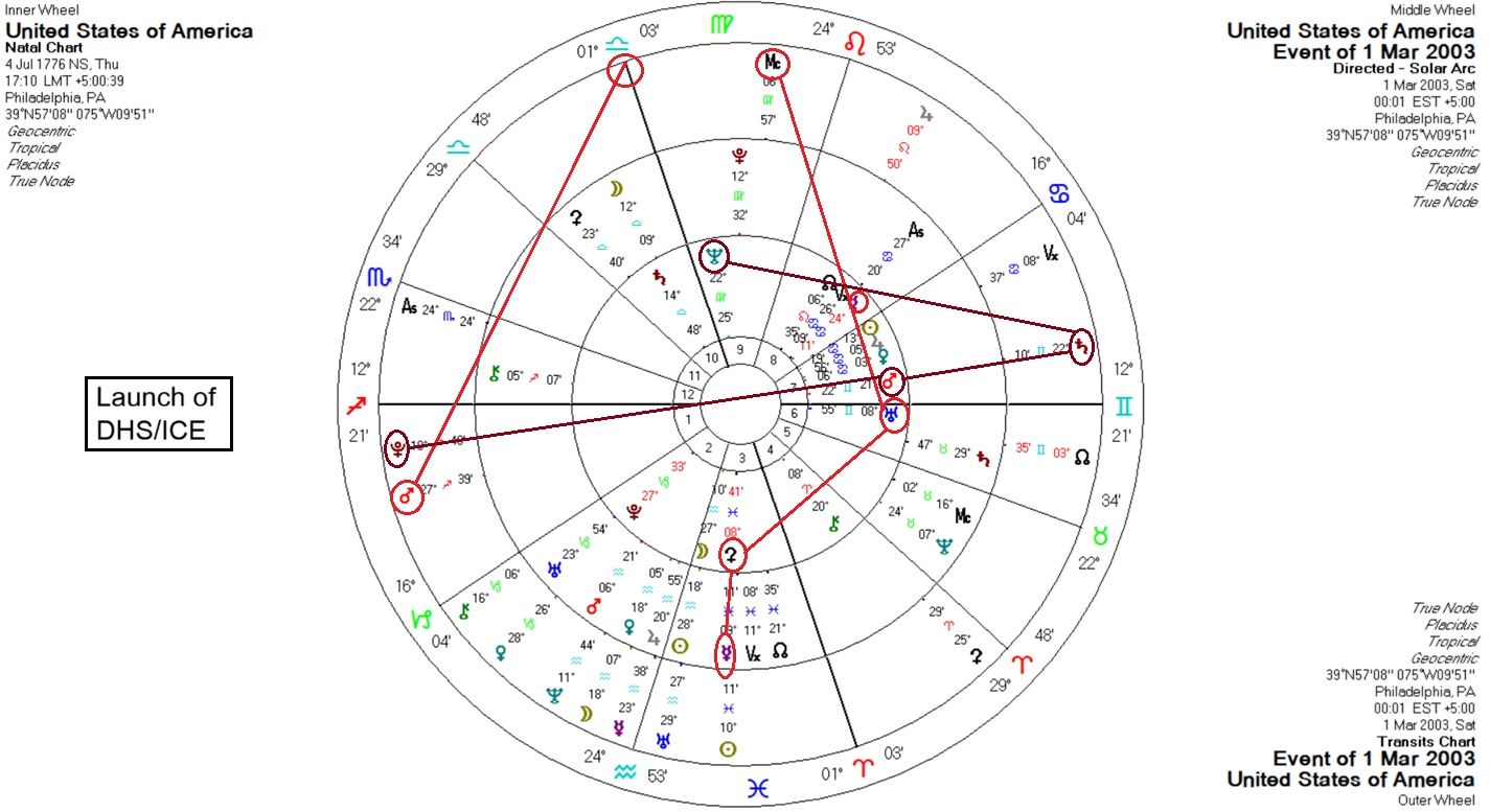 The formation of the DHS and its launch came at a time when transiting Saturn had just passed the US Mars and was squaring the US Neptune, with the natal US Mars/Neptune square representing the more warlike rhetoric that comes out of Washington, along with the American pronounced high idealism and the almost religious feeling Americans are encouraged to exhibit toward our military and policing forces. Transiting Mars at that time was squared to the US Midheaven, showing tensions within the nation. That was the period in the lead-up to the Iraq War, wherein there was widespread resistance in the US to that war. And in the invasion later on that month, the US squandered whatever international goodwill it had after the 9/11 event.