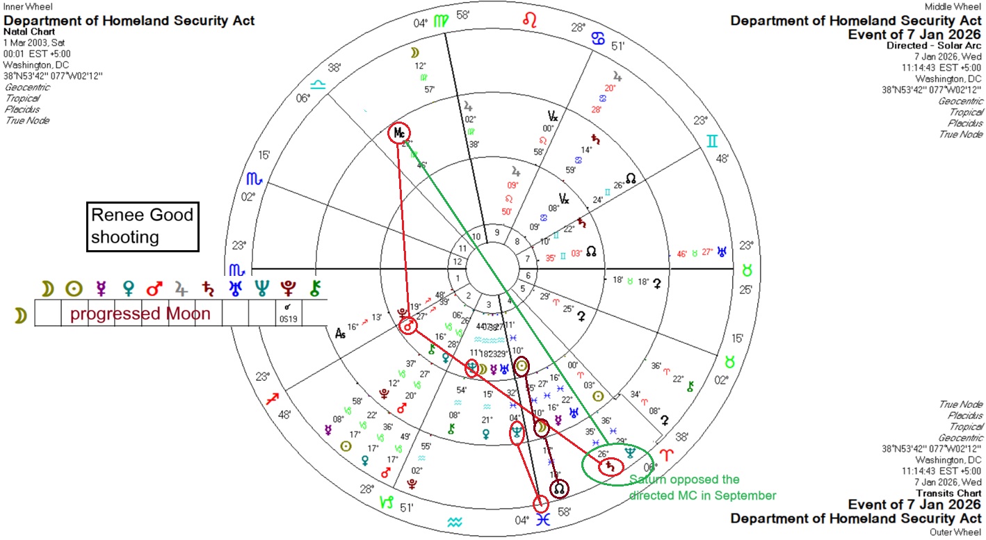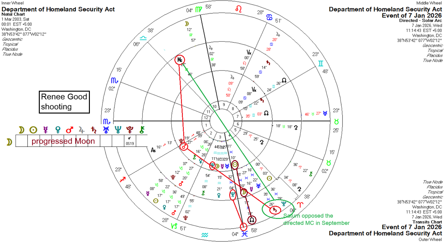 At the time of Renee Good’s killing transiting Saturn was approaching its exact square with Mars in the DHS chart, pointing to frustrations within the agency, the inclination to see itself above the law, and the tendency toward making poor decisions. The progressed Moon had just passed its conjunction with the DHS Pluto which was exact on New Year’s Eve this year. Self-sabotage was indicated in that progression. The directions to the DHS chart are equally as interesting. The chart with transits and directions is below (bigger):