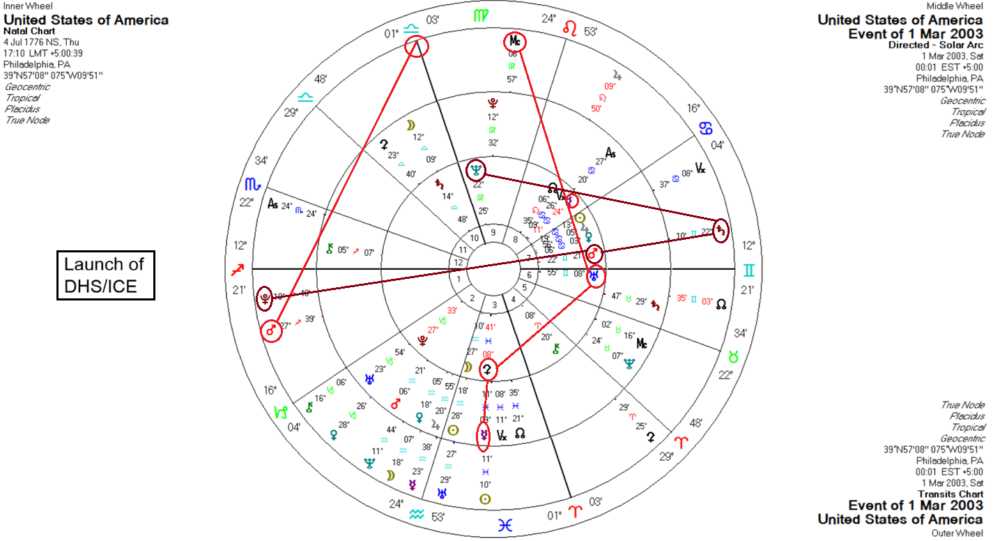 Even more revealing in the astrology of the formation of the DHS was the approaching transit of Pluto at the time of the launch of the DHS, opposite the US Mars, square the US Neptune, and sesquisquare the US North node. This transit of Pluto to the natal Mars/Neptune square is quite revealing, both in terms of what the organization meant for the American public, as well as what it caused overseas, because the formation of the organization came 19 days before the invasion of Iraq by the American-led coalition. It is useful to read what that combination actually represents: