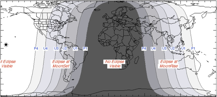 The maximum eclipse occurs over the Pacific. The penumbral eclipse starts at 08:44 UTC, with the final penumbra at 14:23. As stated above, it will be a blood moon over the Pacific. Otherwise it should be significantly darkened for viewers in East Asia, Australia, North America, and Central America. It will arise in Australia and the Far East and set in the far west of the Americas. The penumbral eclipse will last for nearly 3½ hours. Hawaiians, on the other hand, should get a decent view of the blood moon. Europe and Africa will completely miss out, because it will be midday at those longitudes.