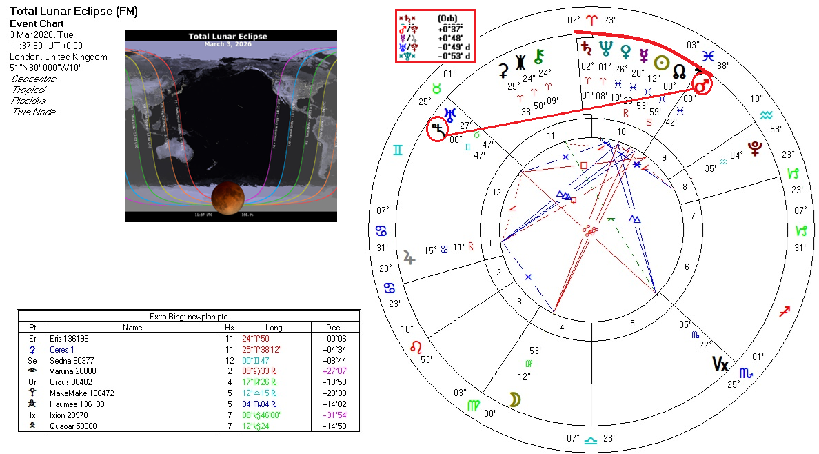 Most of the stellium just mentioned, with the Sun, Mercury, Venus, the north node and Mars are all within Pisces. The eclipse axis itself forms an easy opposition with Jupiter, to which the Sun is trine. This eclipse, like the previous one will be a powerful eclipse. Of particular note is the partile square between Mars and Sedna, which we will explain in a bit. Mars will have just passed its square with Uranus, exact on 27 Feb, which highlights the extreme tensions within the world geopolitical scene over the past weeks.